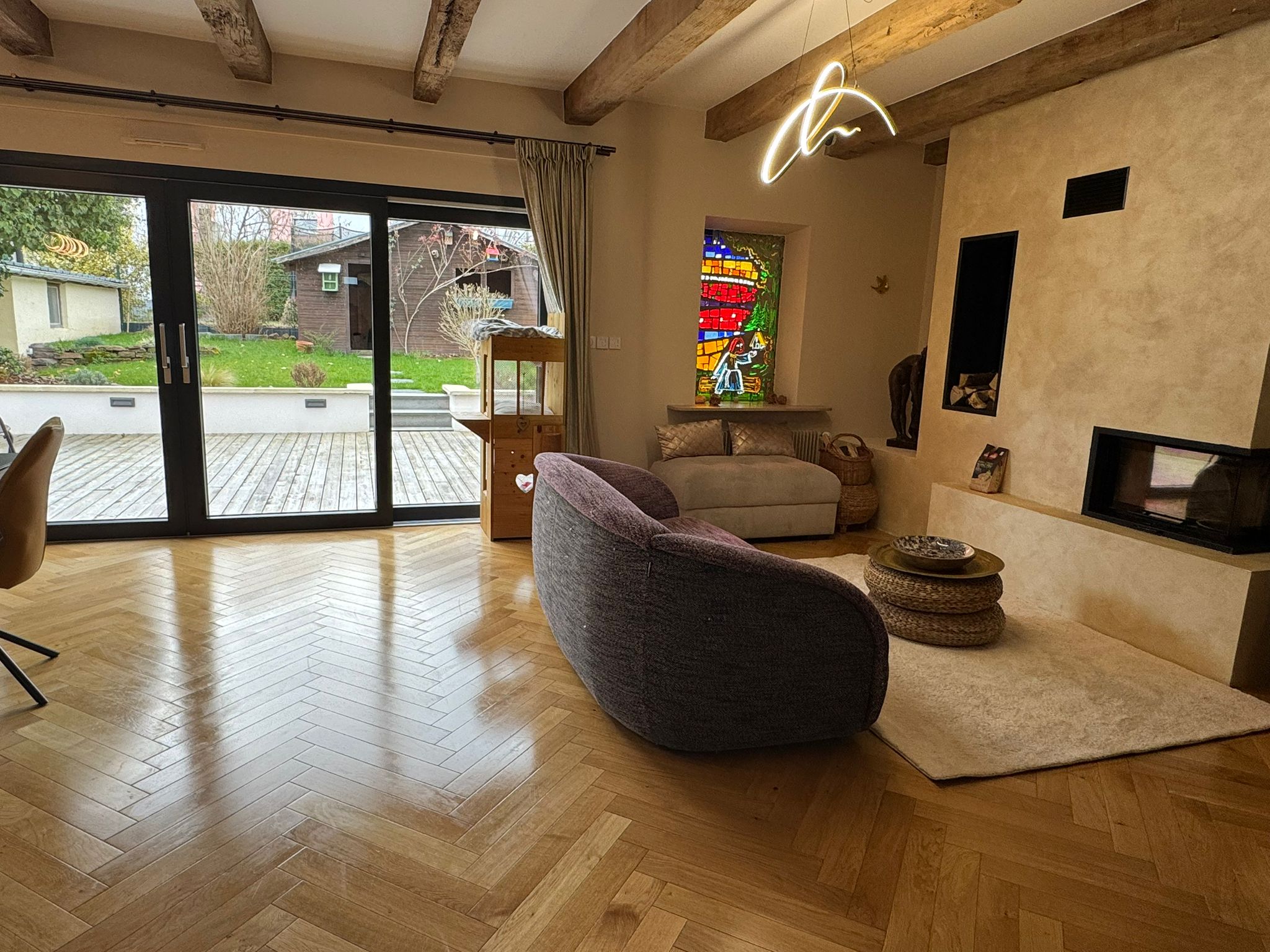 L’entrée, mène à un vaste salon et un second espace de réception agrémenté d’une cheminée à insert bois.